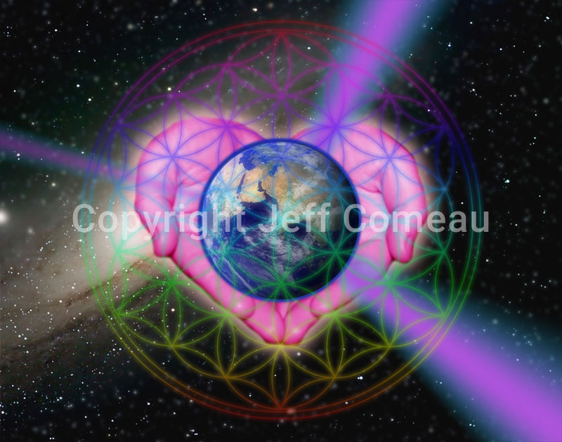 Another version of the Earth being surrounded by the Flower of Life, human palms making a heart shape, with beams being emitted from the center. All You Need Is Love.