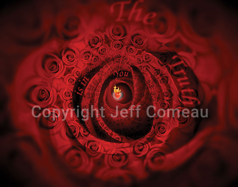 What better way to illustrate the Love of God but showing a rose made from infinite roses, with a burning heart in the center with the words The “Truth Is In You?”